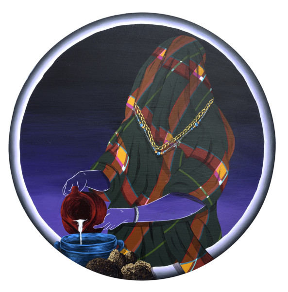 Amir H. Fallah was born in 1979 in Tehran, Iran, and lives in Los Angeles. His body of work includes painting, installation, drawing and sculpture. He is best known for unconventional portraits of people he encounters (or seeks out), which explore identity and personal narrative through his subjects’ interactions with objects. Fallah collages layers of these objects sourced from his subject’s environment and conceals the human subject of the portrait with patterned fabric. The portraits both reference and play off of longstanding Western and Middle Eastern traditions and uses of portraiture. Fallah’s installations further explore and construct narratives about eccentric individuals and influential artists, whose visual representations invite a larger reflection on contemporary artistic practice.